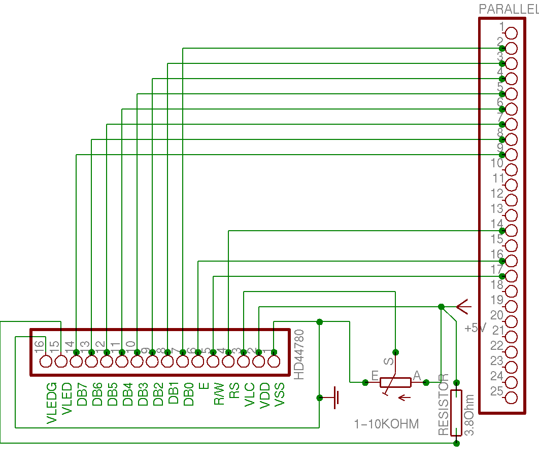 此外,你还需要一块HD44780兼容型LCD显示屏,用来连接到电脑的并口,为了调节对比度,还应该在它们之间联接一个电位计。要想驱动这个系统,仅仅依靠并口的电流是不够的,你需要从系统中获得额外的能量,最好就是使用系统中标准的+5V接口(即用于驱动硬盘,光驱等等的电源接口)。