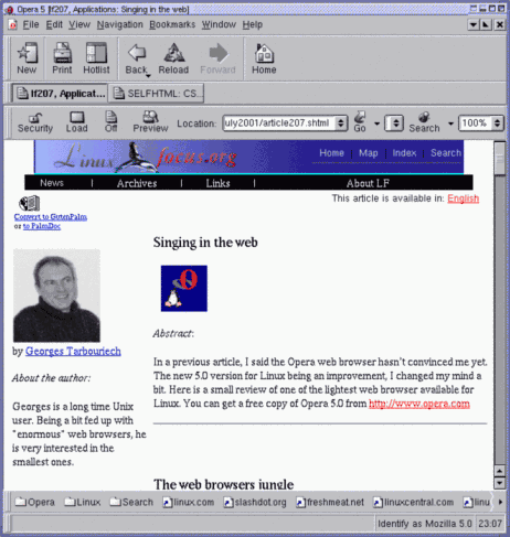 In einem älteren Artikel schrieb ich, dass mich der Opera Browser noch nicht überzeugt hat. Version 5.0 für Linux ist eine Verbesserung, so dass ich meine Meinung ein wenig geändert habe. Hier ist eine kleine Übersicht über einen der kleinsten für Linux verfügbaren Browser. Eine kostenlose Kopie gibt es unter http://www.opera.com.