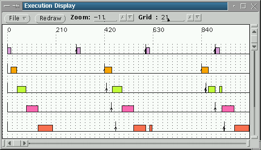 Jeder Task wird durch eine horizontale Achse repräsentiert. Die Rechtecke zeigen die Zeiten, in denen jeder Task den Prozessor nutzt (zu einem gegebenen Zeitpunkt kann nur ein Task ausgeführt werden, denn dies ist ein mono-Prozessor System). In diesem Beispiel ist die Deadline für jeden Task gleich seiner Periode, die Periode von jedem Task wird durch ein Zeitintervall markiert