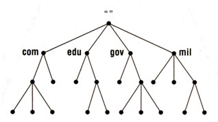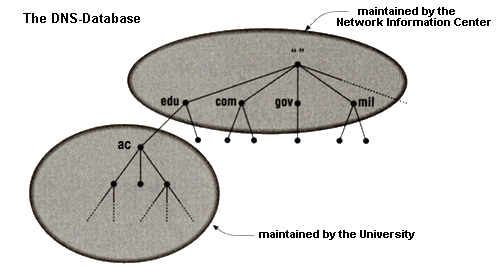 Die Datenbankstruktur des DNS zeigt Abbildung 2. Die Gesamtheit der Datenbank stellt sich in Form eines umgedrehten Baumgebildes dar, wobei die Wurzel (root) an der Spitze sitzt. Der Name der "root" ist die Etikette NULL, die lediglich in Form eines Punktes (".") geschrieben wird. Jeder Knoten des Baums ist sowohl eine Partition der gesamten Datenbank, als auch eine Domain des Domain Name Systems. Darüberhinaus kann nun jede Domain wieder in Partitionen, sogenannte Subdomains unterteilt werden, die sich wie Sprösslinge von den elterlichen Knoten ableiten.