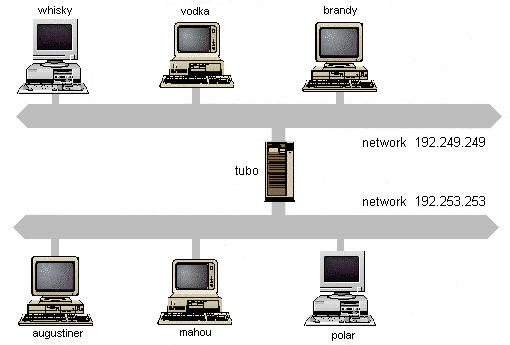 Das LAN des Mathematikinstituts ist über einen backbone (= Rückgard: ich würde es mal Hauptdatenleitung bezeichnen) mit dem LAN des Physikinstituts verbunden. Sie beabsichtigen nun einem Freund, welcher im Physikinstitut arbeitet, Daten zu schicken. Es ist grundsätzlich sehr wichtig zu wissen, daß ihr Computer wie auch der Rechner ihres Freundes unverwechselbare Namen im Netz der gesamten Universität besitzen (gleichermassen verhält es sich bei allen an das Internet angeschlossenen Computer). Damit die beiden physisch voneinder getrennten Netze miteinander kommunizieren können, benötigen sie einen Gateway. Ein Gateway ist ein Rechner, der physisch unabhängige Netze miteinader verbindet. In diesem Falle benötigen wir zwei Gateways - eines für das Netz der Mathematiker und eines für die Physiker. Desweiteren nenne ich den Gatway des Mathematikinstituts "mats" und den Gate für das Physiker-LAN "phys".