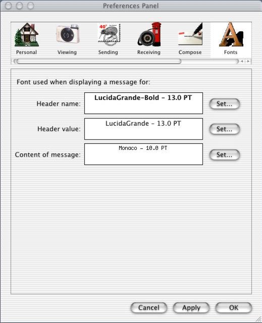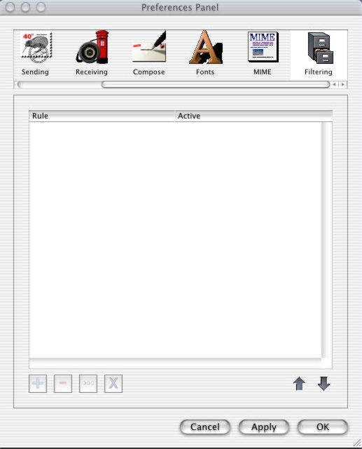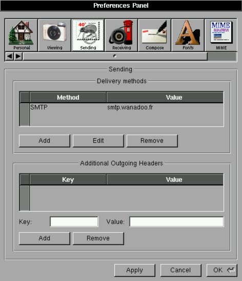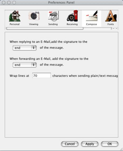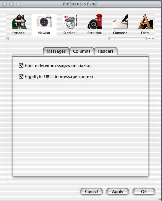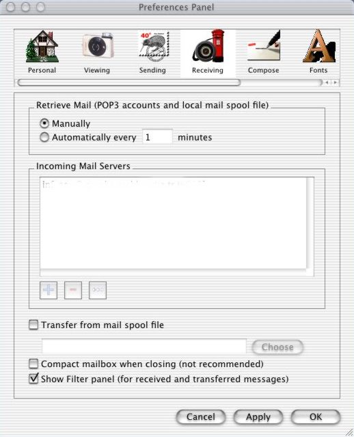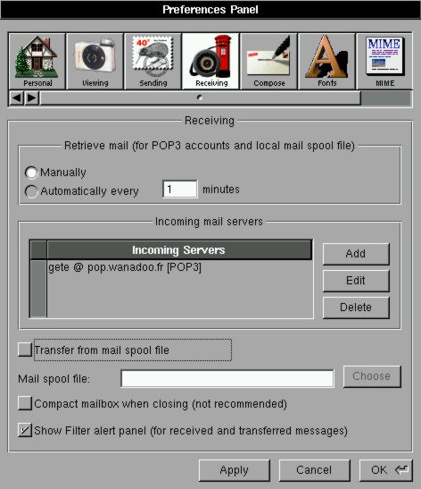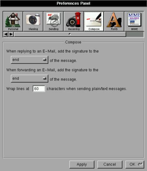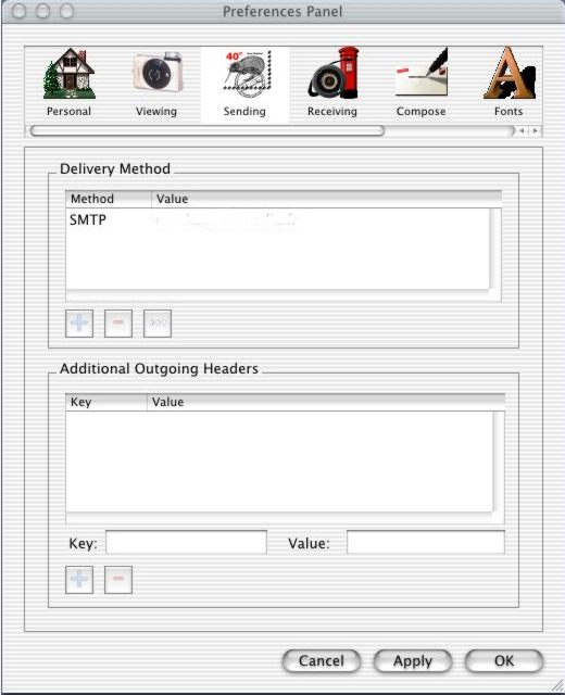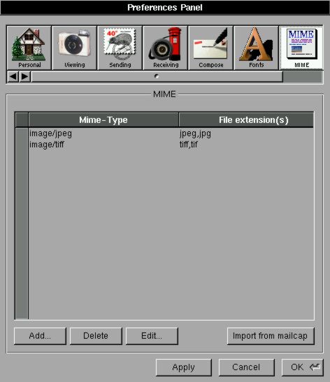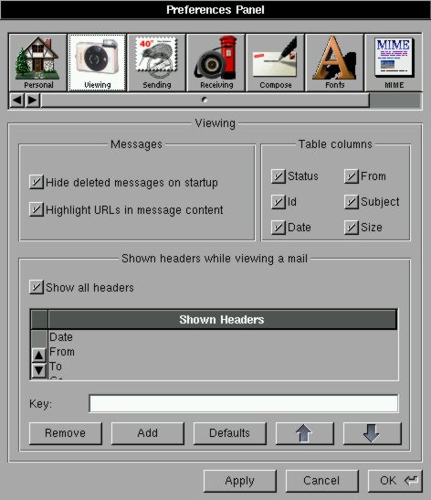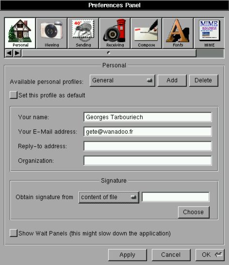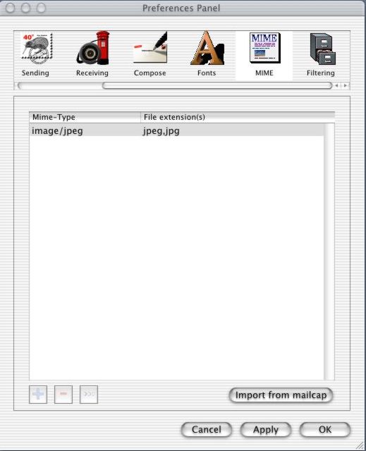 GNUMail.app bietet Ihnen eine recht hübsche Seite für die Einstellungen, was den Konfigurationsprozess recht einfach gestaltet. Diese Seite ist in verschiedene Sektionen geteilt: Persönliches, Anzeige, Senden, Empfangen, Erstellen, Zeichensätze, MIME und Filter.