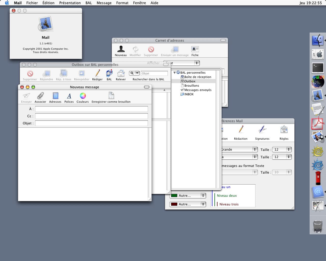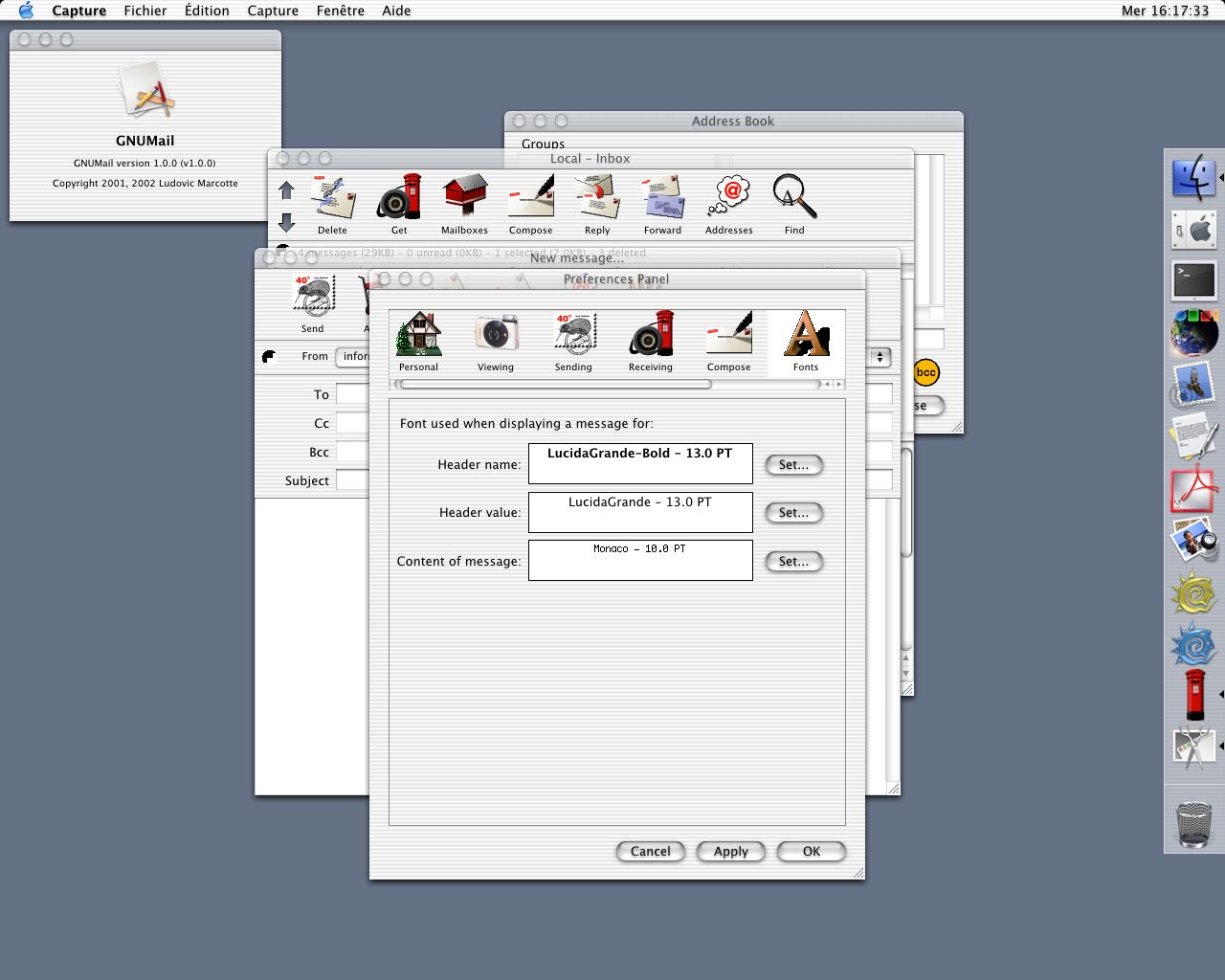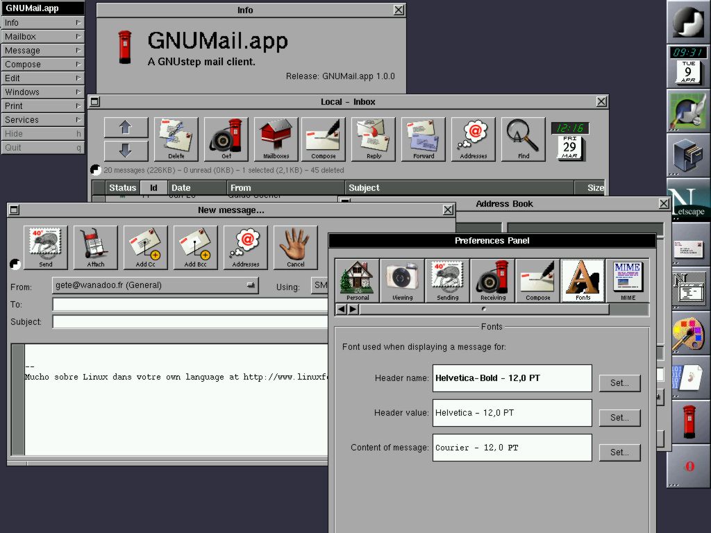 Wie wir bereits erwähnt haben, ist GNUMail.app ein Mail-Client, Abkömmling des NeXT-Mail.app (oder heute der Apple MacOS X Mail.app-Anwendung). Hier ist die ganze Familie: von links nach rechts, der Vater, der Sohn ... und die Neffen.