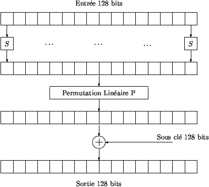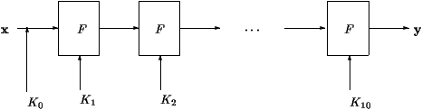 Das Verfahren von AES ist in Abb. 1 beschrieben. Zunächst wird der geheime Schlüssel K0 mit der Nachricht ver-XOR-ed. Danach wir die Funktion F iterativ (wie bei allen "block ciphers") angewandt, unter Benutzung von Unterschlüsseln, die durch eine Schüsselexpansionsroutine erzeugt werden.
