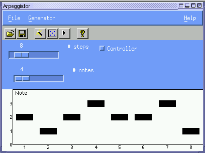 Ich finde es auch interessant, diesen Generator zu benutzen. Ein Arpeggio kann als ein Akkord beschrieben werden, der Note für Note gepielt wird. In anderen Worten, statt alle Noten des Akkords auf einmal zu spielen, werden sie einzeln, einer nach dem anderen gespielt. Manchmal gibt das wirklich einen sehr netten Sound! Besonders gefällt es mir, die Akkorde zuerst zu einem anderen Track zu kopieren, so daß ich einen Track mit den Akkorden und einen mit dem Arpeggio habe. Meistens ergibt dies einen sehr schönen Sound!