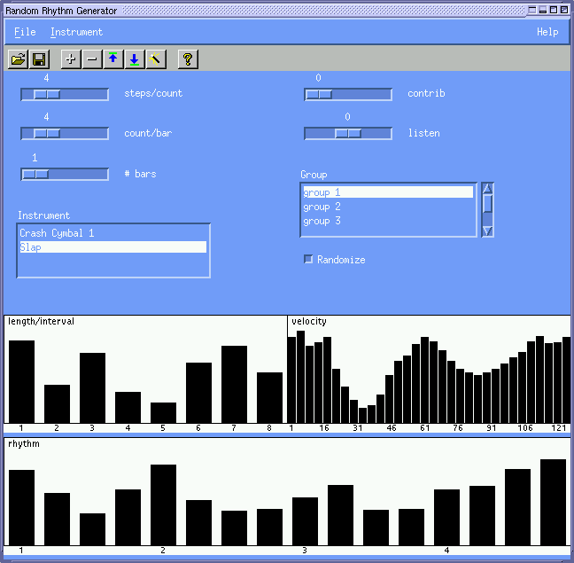 Selektiere den Bereich in deinem Track, wo du den Zufallsrhythmus in deinem Trackfenster haben willst. Öffne den Random Rhythm Generator durch Klicken auf Misc-->Random Rhythm im Menü des Trackfensters. Zuerst solltest du ein Instrument wählen. Danach kannst du alle anderen Variablen einstellen, die du im Fenster sehen kannst und den Rhythmus durch Klicken auf Instrument--> Generate erzeugen. Danach kannst du mit einem weiteren Instrument weitermachen, solange, bis du fertig bist.