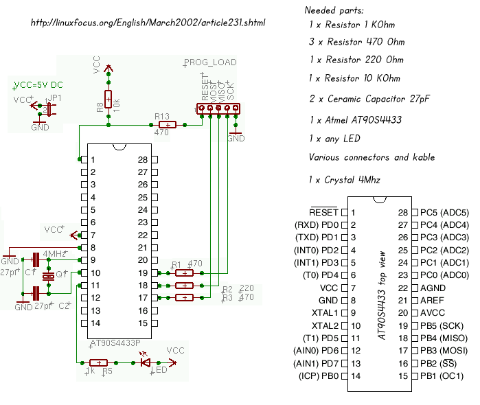 AT90S4433 Microcontroller, a 4Mhz crystal, some cable and a few
