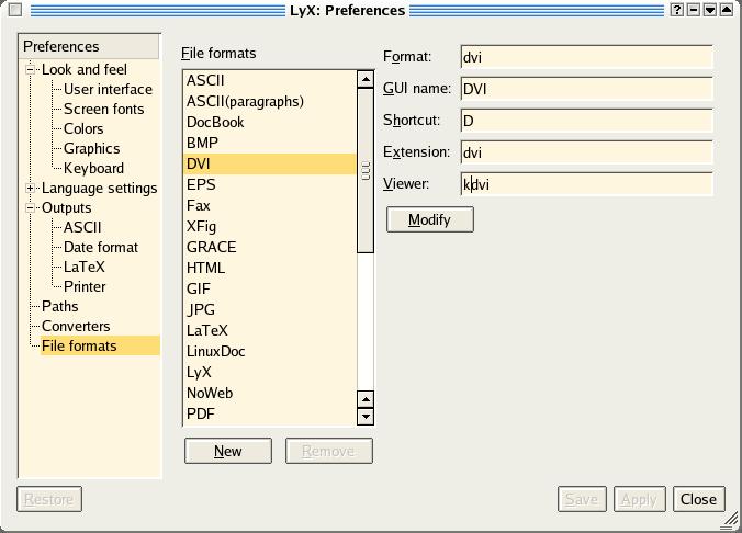 LyX a besoin de vérifier tout d'abord votre installation. Avant de commencer à éditer pour la toute première fois, lancer Editer -> Reconfigurer, ce qui va mettre à jour la base de données interne. Lors d'un changement quelconque de votre installation LATEX, cette étape doit également être relancée. Les résultats de cette étape peuvent être consultées sous Aide -> Configuration LATEX qui nous avertit également où nous procurer d'éventuels paquets manquants. Il est également très utile d'activer la sauvegarde automatique sous Editer -> Préférences, cela ne demande pas beaucoup de temps et peut vous en faire gagner énormément en cas de problème. La visionneuse par défaut pour la sortie est xdvi. Il est chaudement recommander de mettre à la place kdvi, comme montré sur cette capture d'écran. Cela vous donnera une visionneuse bien plus simple à utiliser. Le changement des paramètres n'est appliqué qu'après avoir appuyé sur Modifier.