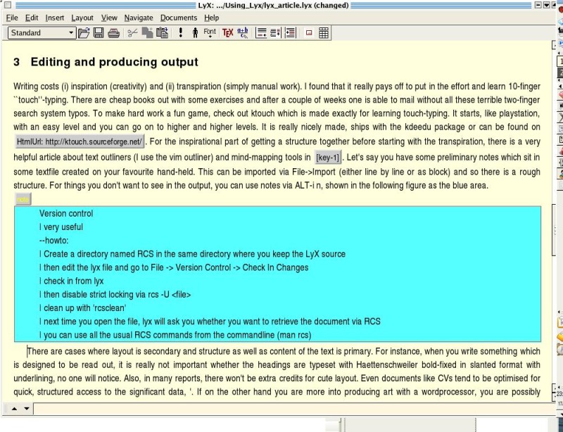 Il n'y a pas grand chose à dire à ce propos étant donné que l'interface contient suffisamment d'explications. Si vous êtes bloqué, jetez un coup d'oeil à la visite graphique mentionnée plus haut. Disons que vous avez quelques notes préliminaires sous un format texte créées avec votre assistant personnel portable. Elles peuvent être importées via Fichier->Importer (soit en lignes ou en paragraphes), ce qui vous donne une structure brute pour démarrer. Celle-ci peut maintenant être convertie en segments de texte. La liste disponible sur la barre d'outils présente les options possibles pour un style de fichier défini. Généralement, on peut affecter le style standard via ALT-p s et les titres via ALT-p n où n est un chiffre entre 1 et 6 (plus le chiffre est petit, plus le titre sera grand). Pour les éléments que vous ne voulez pas voir apparaître dans la version finale, vous pouvez utiliser les notes via ALT-i n, comme montré dans l'image suivante dans la zone bleue.