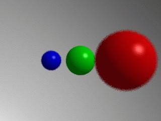 Profondeur de champ (mise au point)Pour finir, passons à un autre effet intéressant offert par RenderMan, la profondeur de champ ("Depth of Field") ou mécanisme de mise au point (focus). La directive utilisée pour activer cette fonctionnalité est DepthOfField. Cette commande prend trois paramètres : f-stop, fov (field of view) and focus-lenght (distance focale). Le premier paramètre, f-stop, définit la distance limite pour la mise au point, dans notre exemple, un objet situé à 2 unités ou moins de la caméra apparaitra uniformément hors du champ. Le paramètre fov est en général laissé à la valeur 1.0 si la perspective a été préalablement définie avec Projection "perspective" "fov" 45 (comme dans notre exemple), en changeant la valeur on ne fait que multiplier le paramètre fov de la directive perspective. Enfin, focus-lenght est le paramètre qui nous intéresse ici, il définit la distance à partir de laquelle les objets apparaissent comme étant hors du champ de mise au point. Dans l'example suivant, la caméra est à l'origine et les trois balles à distance de 10, 20, 30 unités. Nous allons calculer plusieurs images avec différentes valeurs du paramètre focus-lenght. Pour la première image, on a utilisé DepthOfField 2.0 1.0 10, ce qui signifie que tous les objets situés à plus de 10 unités de la caméra seront hors champ.