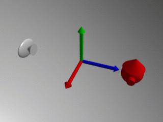 Il y a une translation (Translate 0 0 20) et deux rotations , une autour de l'axe des x (Rotate 45 1 0 0) et l'autre autour de l'axe des y (Rotate 135 0 1 0). L'ordre des opérations dans cet exemple apparaîtra peut-être embrouillant aux utilisateurs de Pov-Ray, car avec celui-ci les opérations sont appliquées dans l'ordre d'apparition, mais ce n'est pas le cas avec RenderMan. RenderMan stocke toutes les opérations en attendant de trouver un mot clé particulier (dans cet exemple : WorldBegin), et alors seulement les transformations sont appliquées à la scène. Ce système d'empilement des transformations a pour conséquence que les transformations sont appliquées dans l'ordre inverse d'apparition, ou plus simplement que la dernière transformation définie est appliquée en premier. Nous pouvons alors interpréter comme suit les opérations de notre exemple : N'oubliez jamais que toutes les transformations du système de coordonnées courant (rotations et translations) sont toujours relatives à la caméra, ce qui signifie qu'une rotation autour de l'axe des x doit être compris comme une "rotation autour de l'axe x de la caméra". Passons maintenant à la partie la plus intéressante de cet article, comment utiliser le modèle de caméra pour réaliser des effets spéciaux. Motion blur (simulation d'objets en mouvement)Le premier effet possible avec la caméra est le Motion blur, qui simule la trainée laissée sur un film par des objets en mouvement. On active le Motion Blur en insérant une directive Shutter 0 1 dans la section de notre fichier d'exemple qui définit la caméra. La commande Shutter 0 1 simule le temps d'exposition, dans ce cas, l'ouverture du diaphragme a lieu à l'instant 0 pendant une unité de temps. Les paramètres 0 1 pour shutter sont quasi universels et nous utiliserons toujours ce paramètre car il n'indique qu'un comportement précis de la caméra de RenderMan. Ensuite nous devons indiquer à RenderMan quels éléments de la scène sont en mouvement, ce que nous faisons en insérant la paire de tags MotionBegin MotionEnd. Les illustrations suivantes montrent un exemple (et le fichier RIB source) d'un balle se déplaçant de la position 0 10 5 à l'instant 0 vers 5 10 0 à l'instant 1. La directive MotionBegin [0 1] dans le fichier RIB spécifie exactement à Renderman quand ont lieu les transformations (l'instant 0 correspond à la première et l'instant 1 à la seconde) et les valeurs numériques doivent correspondre avec celles de la section Shutter. L'illustration montre que cet effet apparait assez réaliste et cette impression est encore meilleure pour une animation.