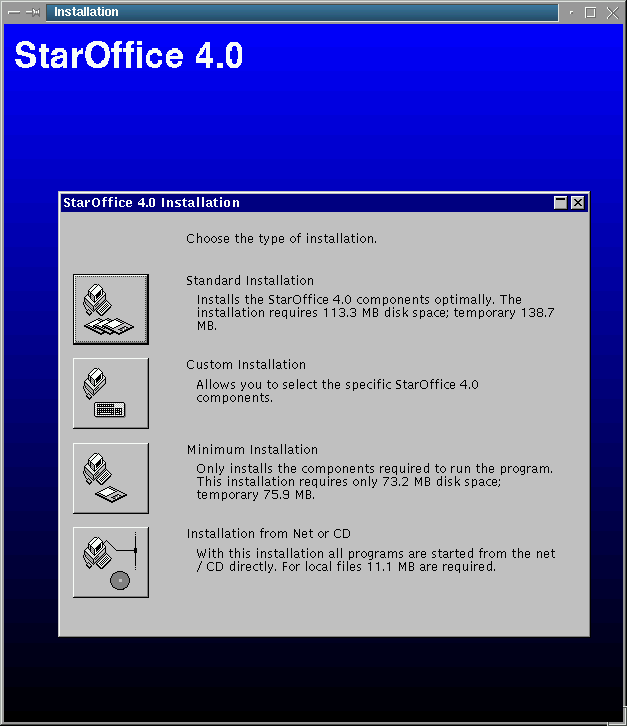 ¼³Ä¡ÇÏ´Â ¹æ¹ý¿¡´Â Å©°Ô µÎ°¡Áö ¹æ¹ýÀÌ ÀÖ´Ù. °³ÀοëÀ¸·Î ¼³Ä¡¸¦ ÇϵçÁö ½Ã½ºÅÛ¿¡ ÀÖ´Â »ç¿ëÀÚ°¡ ¸ðµÎ ÀÌ¿ëÇÒ ¼ö ÀÖµµ·Ï ¼³Ä¡ÇÒ ¼öµµ ÀÖ´Ù. ¸¸¾à½Ã½ºÅÛ¿¡ ÀÖ´Â »ç¿ëÀÚµéÀÌ ¸ðµÎ »ç¿ëÇÒ ¼ö ÀÖ°Ô ÇÏ·Á¸é /net¿É¼ÇÀ» ÀÌ¿ëÇÏ¿© ¼³Á¤ÇÁ·Î±×·¥À» ½ÇÇà½ÃÄÑ¾ß ÇÑ´Ù. ¶ÇÇÑ ¸ðµç »ç¿ëÀÚ°¡ Á¢±Ù±ÇÇÑÀ» °¡Áö´Â ¸®³ØÅ丮¿¡ ¼³Ä¡ÇÏ¿©¾ß ÇÑ´Ù. ÁÖ·Î /optµð·ºÅ丮¿¡ ÇÏ´Â °ÍÀÌ ÀϹÝÀûÀÌ´Ù. ¼³Ä¡Çϴµ¥´Â ¾à 114MbÀÇ µð½ºÅ©°ø°£ÀÌ ÇÊ¿äÇÏ´Ù. ÇÁ·Î±×·¥À» »ç¿ëÇÏ°í ½ÍÀº »ç¿ëÀÚ´Â /opt/Office40/bin/setupµð·ºÅ丮ÀÇ ÇÁ·Î±×·¥À» ½ÇÇàÇÏ¿© "Install from CD or net"¿É¼ÇÀ» ¼±ÅÃÇÏ¸é µÈ´Ù. °¢ »ç¿ëÀÚ°¡ ¼³Ä¡Çϴµ¥¿¡´Â ¾à 12Mb°¡ ÇÊ¿äÇÏ´Ù.