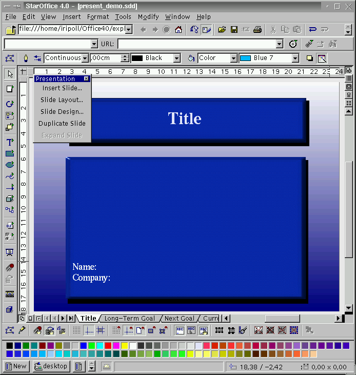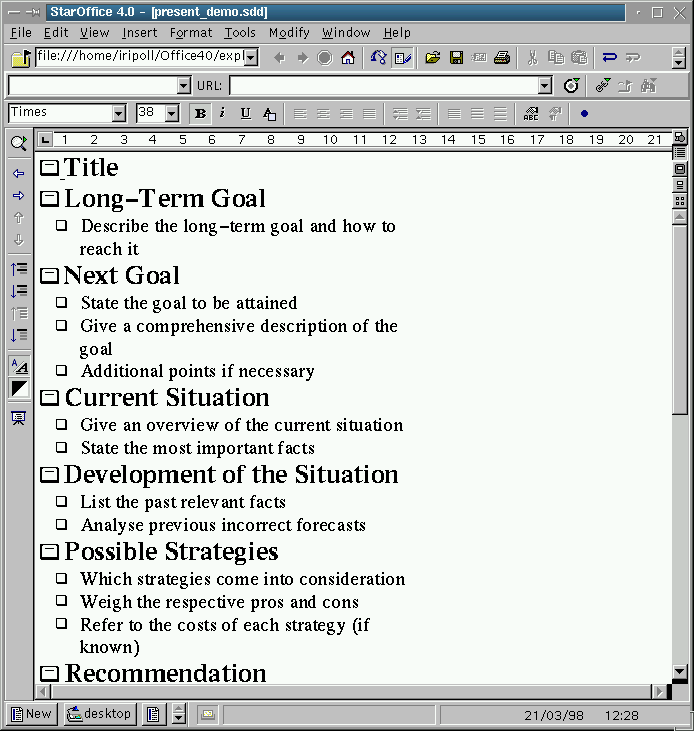 º» ±ÛÀº StarOffice 4.0 ¿¡ ´ëÇÑ °³·«ÀûÀÎ ¼Ò°³¸¦ ´ã°í ÀÖ½À´Ï´Ù. StarOffice°¡ Á¦°øÇÏ´Â ±â´ÉÀ» ±Û Çϳª¿¡ ¸ðµÎ ´ã±â´Â ³Ê¹« ¹æ´ëÇÕ´Ï´Ù. StarOffice¿¡ °üÇÑ Ã¹¹øÂ° ±Û¿¡¼­´Â ¸ÕÀú ÇÁ¸®Á¨Å×À̼ÇÀ» ¸¸µé¼ö ÀÖ´Â ÀÀ¿ëÇÁ·Î±×·¥(¸¶Ä¡ MSÀÇ PowerPoint¿Í °°Àº)À» »ìÆìº¸°Ú½À´Ï´Ù. °è¼ÓµÇ´Â ¿¬Àç¿¡¼­ ¿öµåÇÁ·Î¼¼¼­, ½ºÇÁ·¹µå½ÃÆ®, À¥ ³×À̰ÔÀÌÅÍ µîµîÀÇ ´Ù¸¥ ÇÁ·Î±×·¥µéÀ» »ìÆìº¸°Ú½À´Ï´Ù.