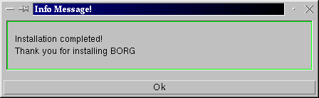 Для использования BORG в вашей системе необходимо установить Java runtime или develpment environment. Каталоги borg_install/install_for_jre1.1.xi и borg_install/install_for_jre1.2.x предназначены для использования в зависимости от установленной у вас Java environment. В каждом каталоге находятся три установочных файла - install.bat для Window$ систем, install.sh и install.x11 для UNIX систем. В UNIX/Linux install.sh используется для установки BORG в консольном варианте и install.x11 для X Window.